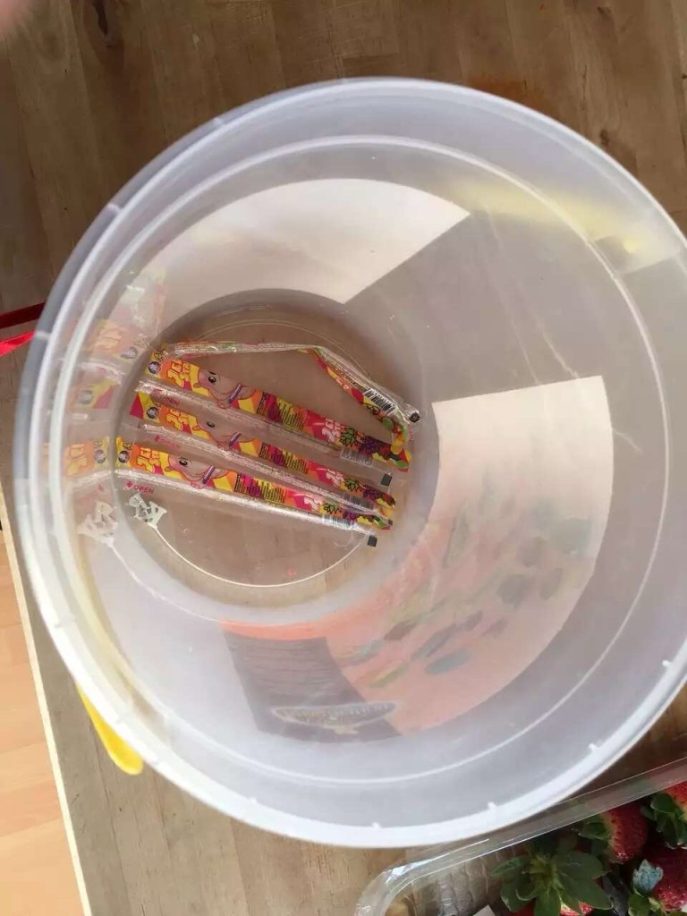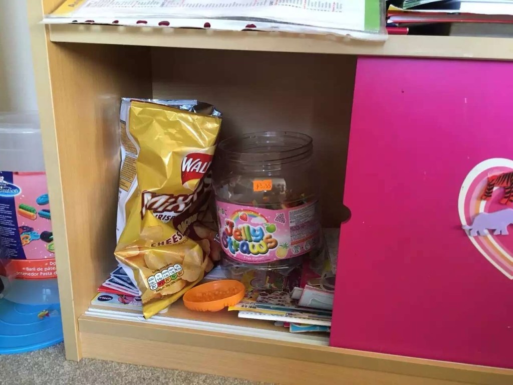 早上打扫卫生,偶然间居然发现甜胖子的”零食间”!妈妈平时不许她多吃零食,甜胖子居然自己藏一些在书柜里,更绝的是,还再找个手工的小桶放垃圾,这样吃了零食不用跑厨房去扔包装袋。[憨笑][憨笑][憨笑]