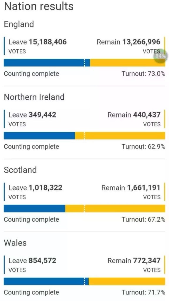 英国人不喜欢东欧移民的程度已经到了可以拿这个国家的未来做赌注的地步。全英国只有两大地区支持留欧,一个是经济发达的伦敦,一个是靠出口水产的苏格兰。其它靠吃福利的地区清一色地支持脱欧。