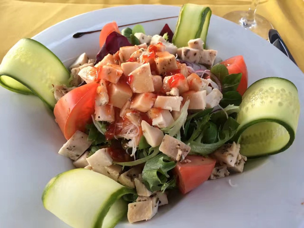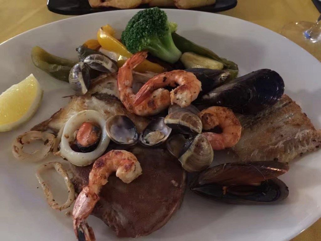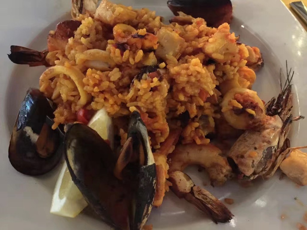 在群岛度假的一个认知误区就是以为周围海域应该有着丰富的鱼类,于是误信本地旅行团的花言巧语,花了八十欧元出海看海豚和鲸鱼。在茫茫大海上颠簸了三个小时,如海底捞针般寻找海豚的踪迹,最终只看到一只海龟和一条飞鱼(Life of Pi里如蝗虫般漫天飞舞的那种)。晚餐是西班牙海鲜饭,口味尽然还不如谢村的。儿童餐的披萨倒是大得惊人,甜胖子的胃口同样大得惊人,居然吃完了。