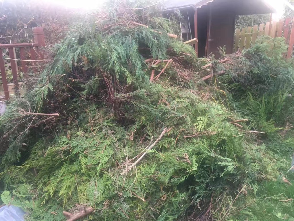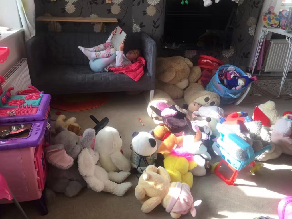 这个周末的大工程,就是把后花园那堵两米多高的树墙削成了一米五。剪下来的树杈堆积如山,英国政府现在穷得连垃圾都收不起,居民的花园垃圾(Green Waste)得自己想办法回收。俩妞在家无聊,芊芊静静地看书,甜胖子把娃娃们抱出来晒太阳。