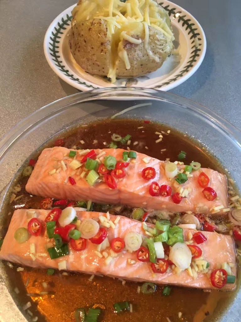 英国中小学暑假正式开始,星期天像我一样还埋在书房里加一天班的估计也没几个了。祭出最得意的原创菜式“香辣三文鱼”来养胃。小时候有篇著名的高考作文《妈妈喜欢吃鱼头》,我们家甜胖子在的时候,妈妈只有鱼皮吃,爸爸也就闻个味,为人父母大抵如此。