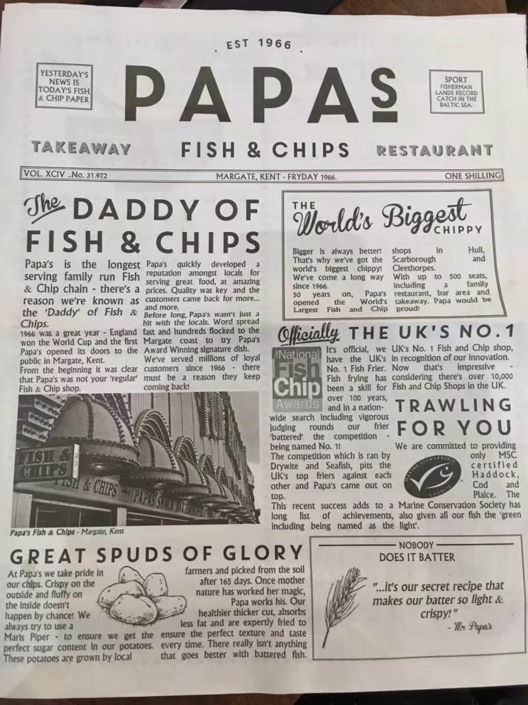 全英国最大的鱼排店。各行各业都有做得好的佼佼者,鱼排店这种路边摊居然也让这家人做到500座的大店,还在全英开了四间,也是路边摊的霸主了。