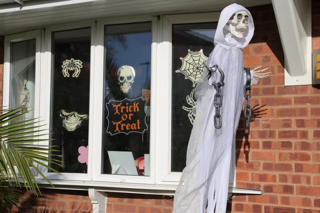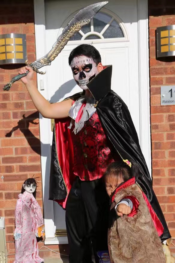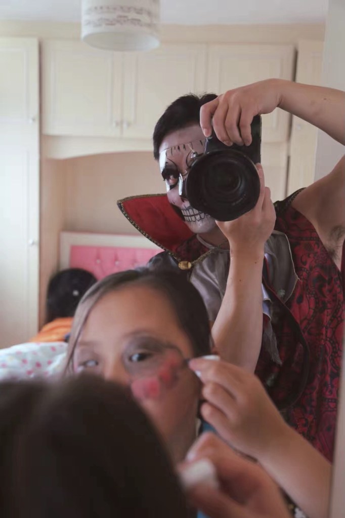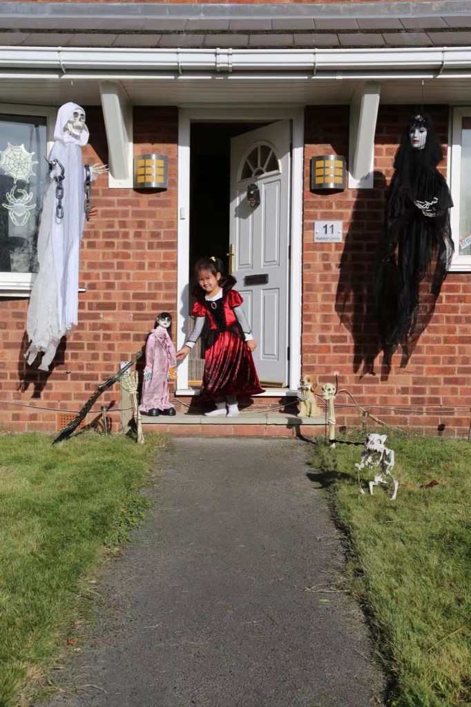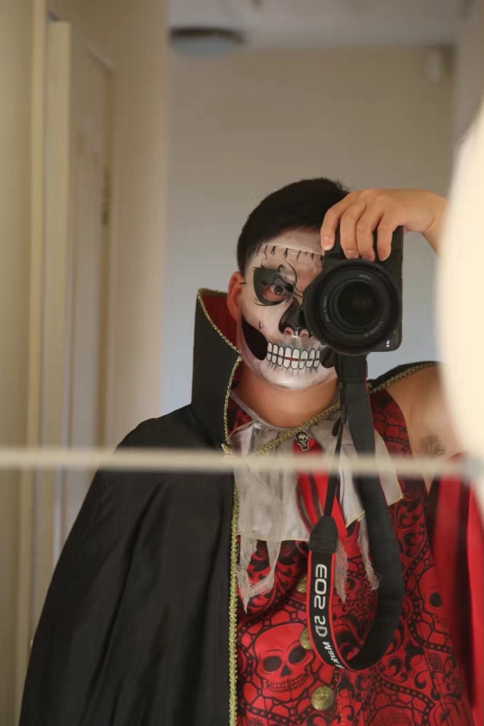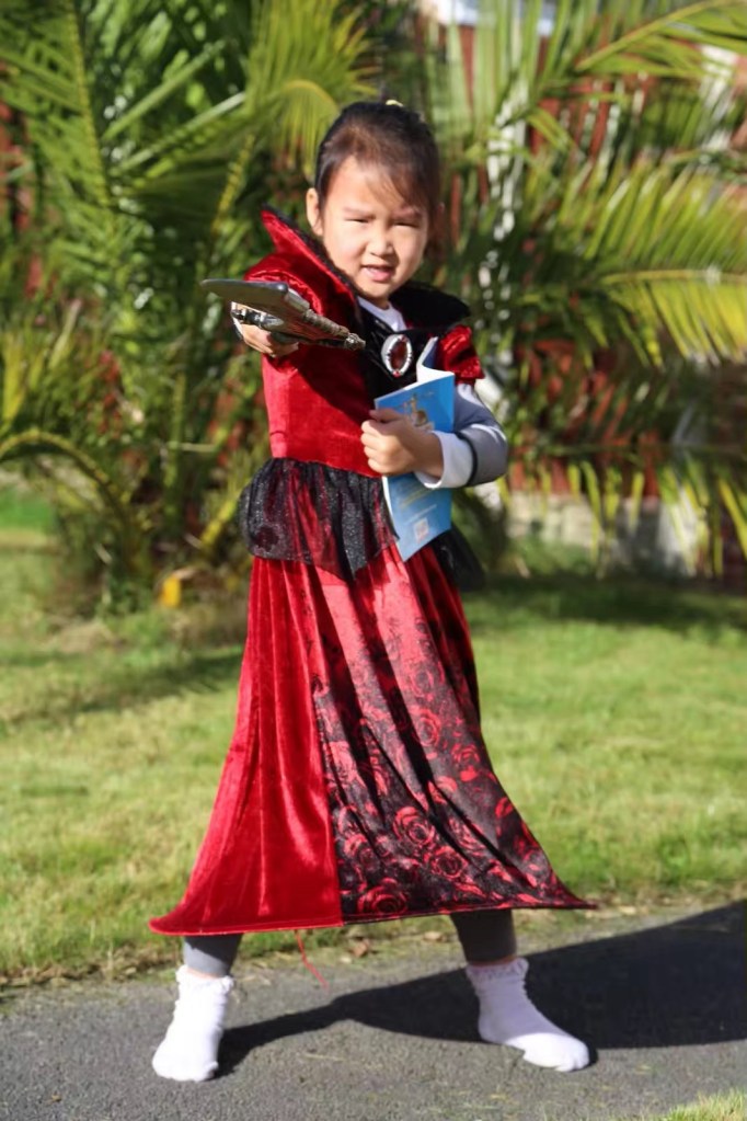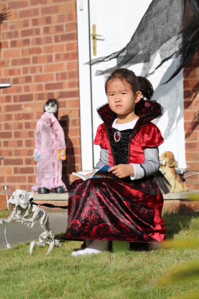 又到了一年一度最好玩的节日,万圣节。一大早起来盛装打扮,准备参加市中心的群魔大会。我这身装扮回头率也是相当高。金秋的第一个大晴天,等姐姐化妆的时候,甜胖子坐在前花园,守着一堆妖魔鬼怪,沐浴着阳光读本书,甚是惬意。