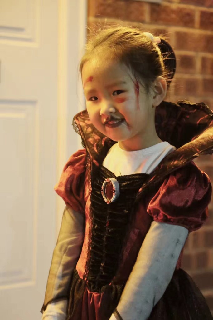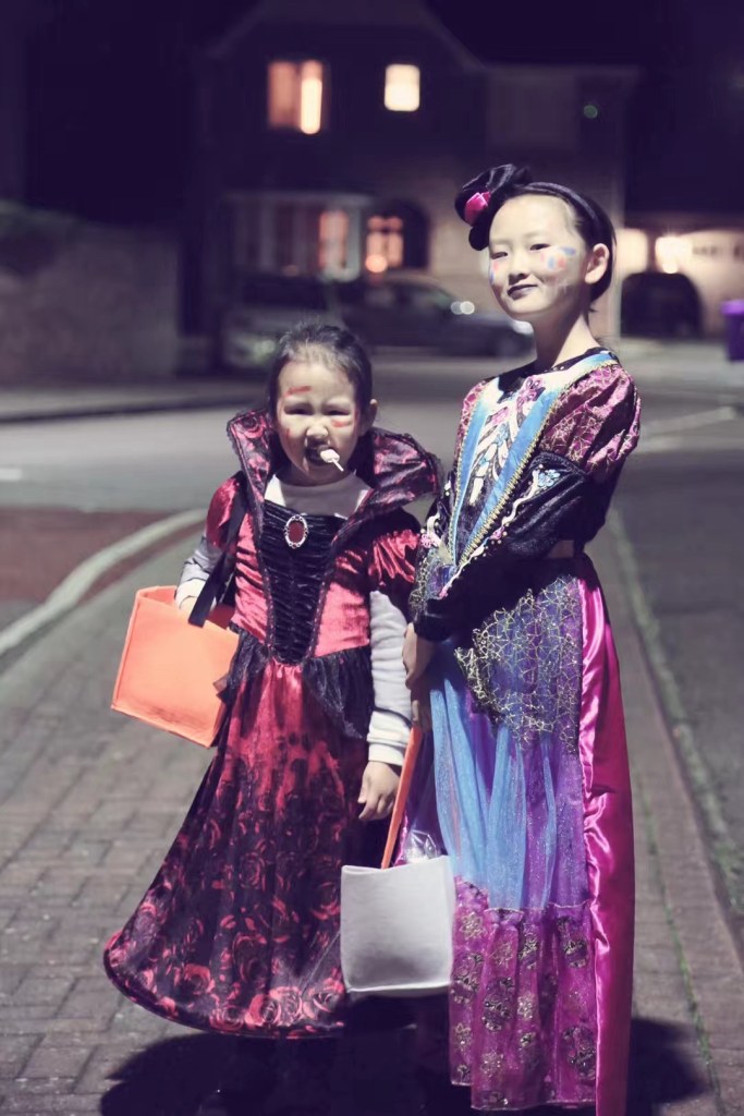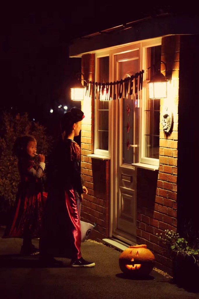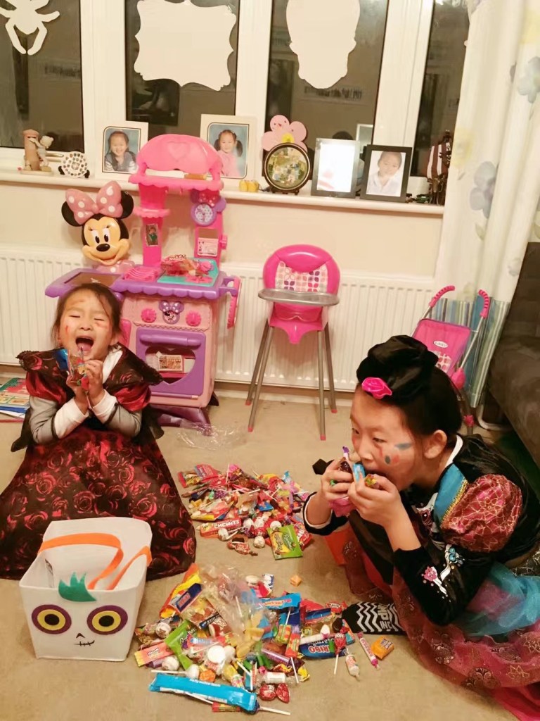万圣节之夜,晚饭都没吃就跑出去讨糖果。两个半小时,跑了近百户人家,讨得三百多颗糖果,满载而归。甜胖子对糖果有着与生俱来的眷恋,如珍似宝地把自己那份数了好几遍,搂在怀里生怕被我抢了去。