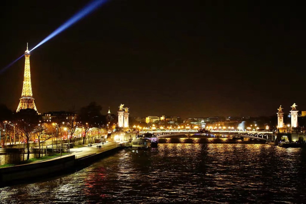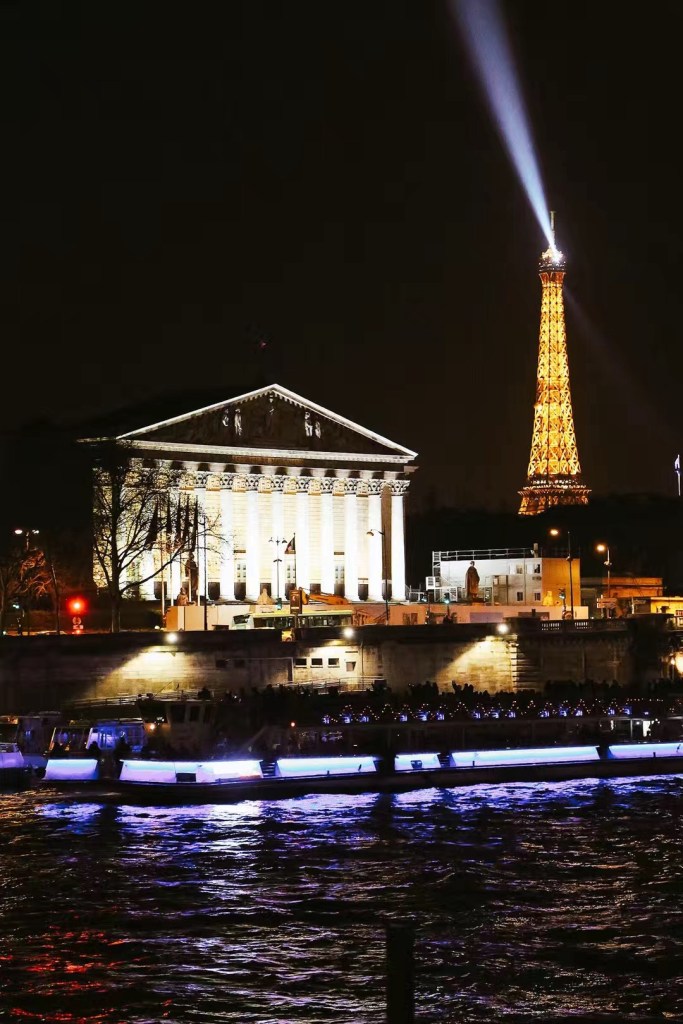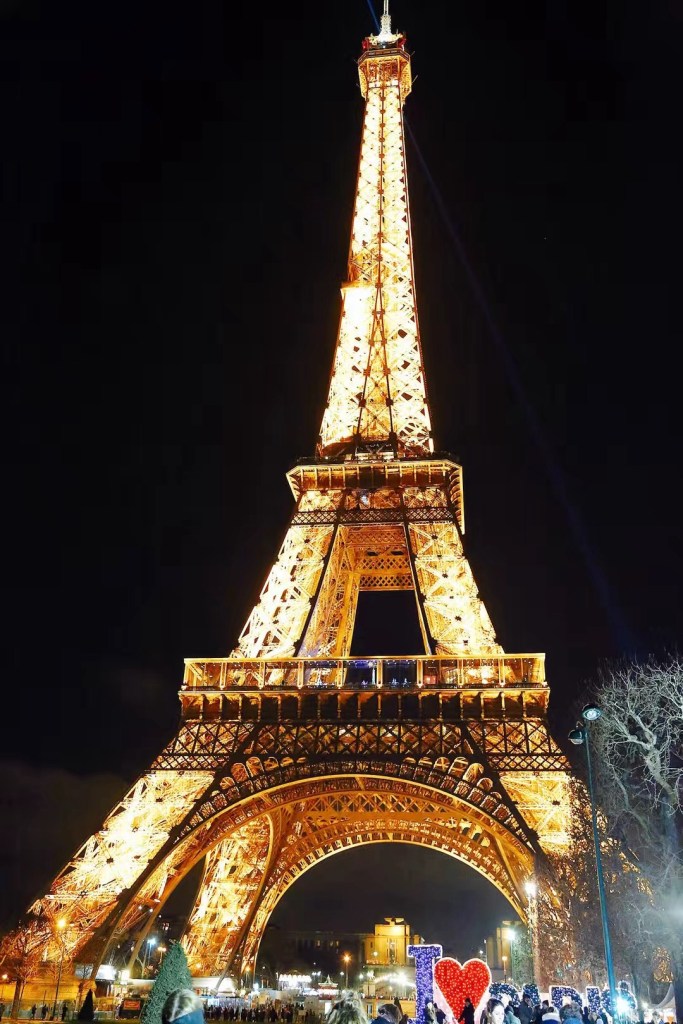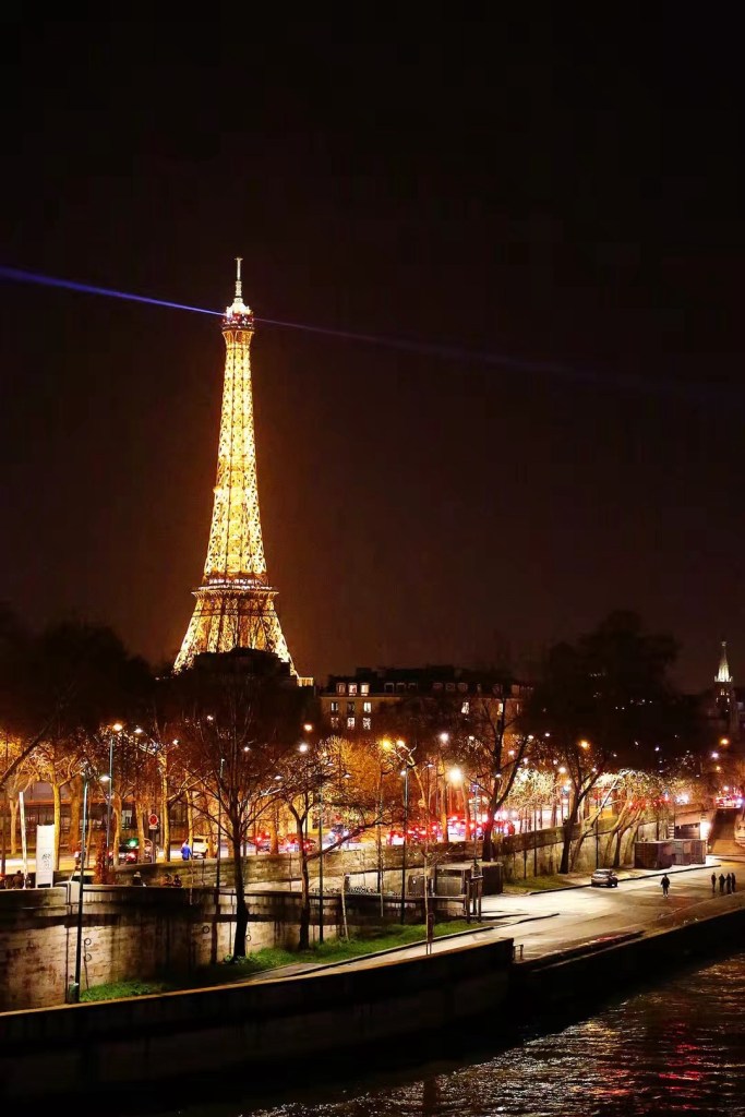 入夜后的埃菲尔铁塔美得近乎妖艳,通体金黄的流光映在深邃的黑夜里,令人叹为观止。