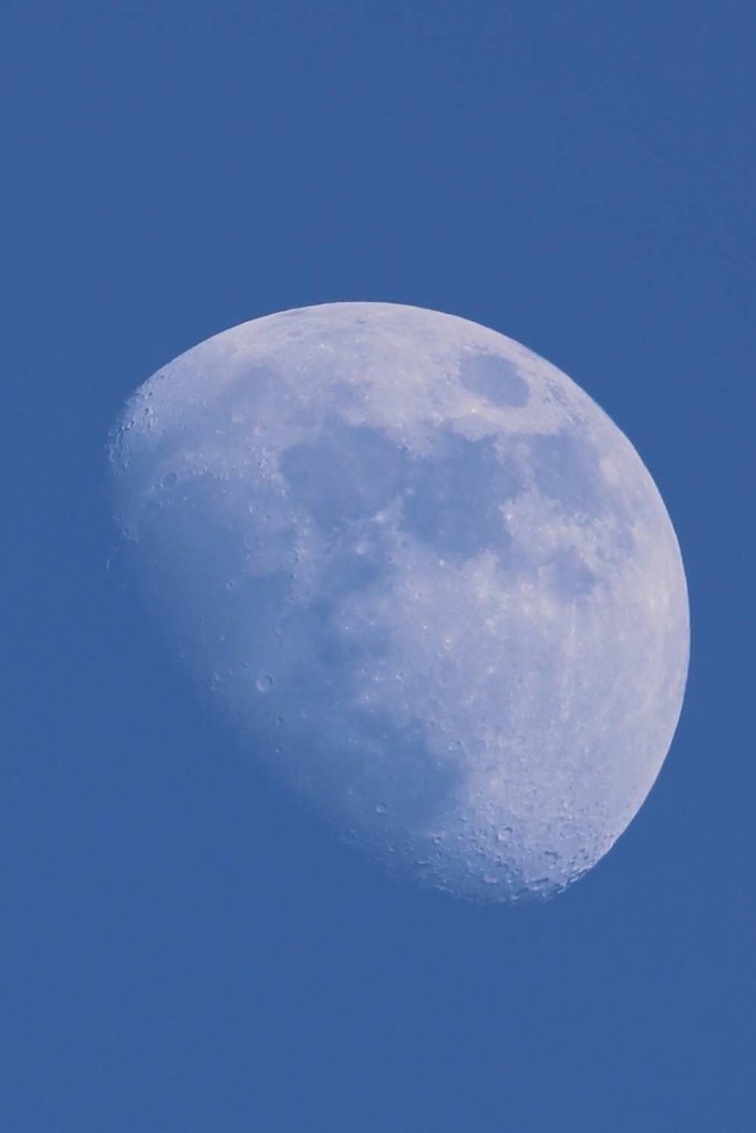 我用高倍长焦镜头拍的月亮,可以清晰地看到月球表面的陨石坑。今日依然严寒,好在碧空无云日月同辉,春景拍出了秋景的韵味。