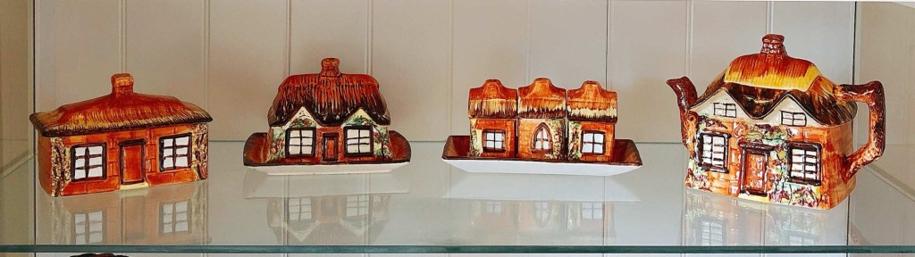 在古玩店里攒齐了这一套维多利亚时代英式下午茶的茶具,茶具的外形是当年的英国村庄,从左到右分别是,黄油盒,糕点盘,调料瓶,和大茶壶。维多利亚时代(1837-1901)是英国历史上的鼎盛时期,不幸也是中国历史上最屈辱的时期。