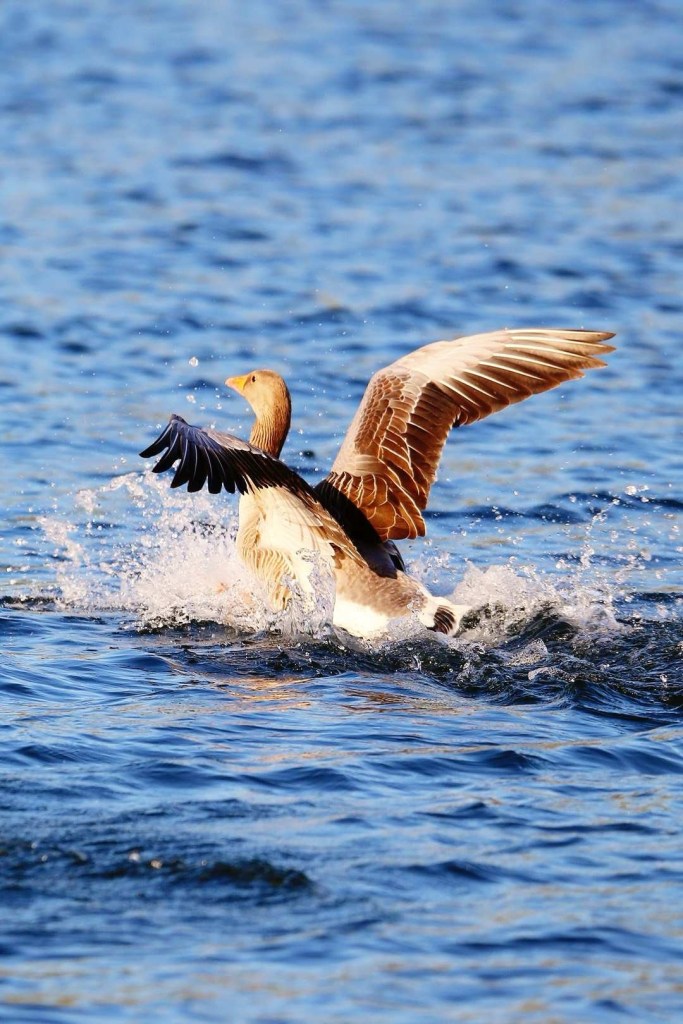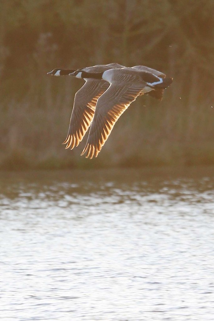 终于盼到春暖花开。这个时节的湖边一派欣欣向荣的景象。有幸抓拍到一张两只大雁比翼齐飞,映着暮霭斜阳,颇有些诗情画意。