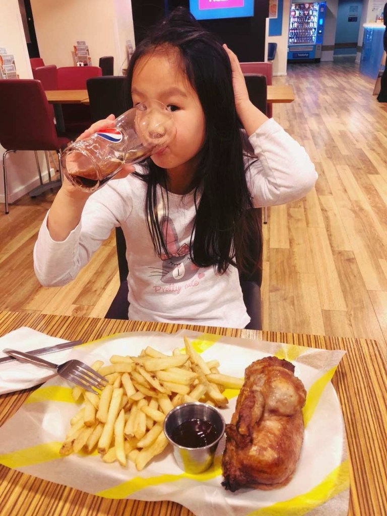 明天清晨6点半的飞机,今晚在机场附近住一晚。一家四口有两个减肥和一个保持身材的,只有甜胖子不停地喊饿,晚上八点半,独自在餐厅,半只烤鸡,一大份薯条,一大杯可乐,风卷残云。