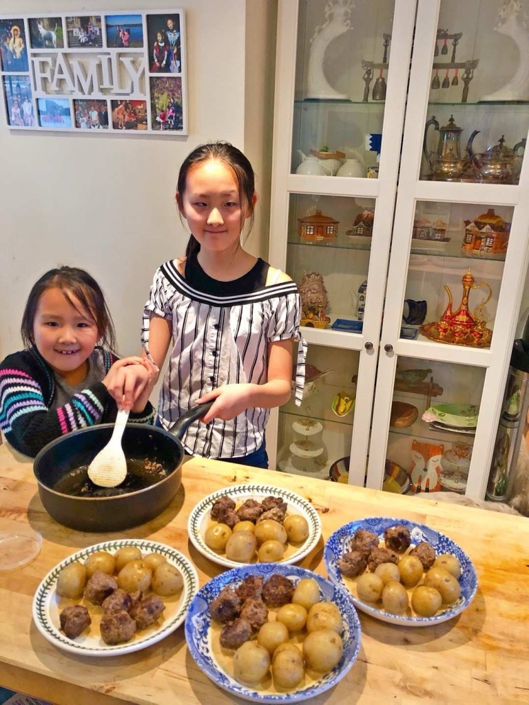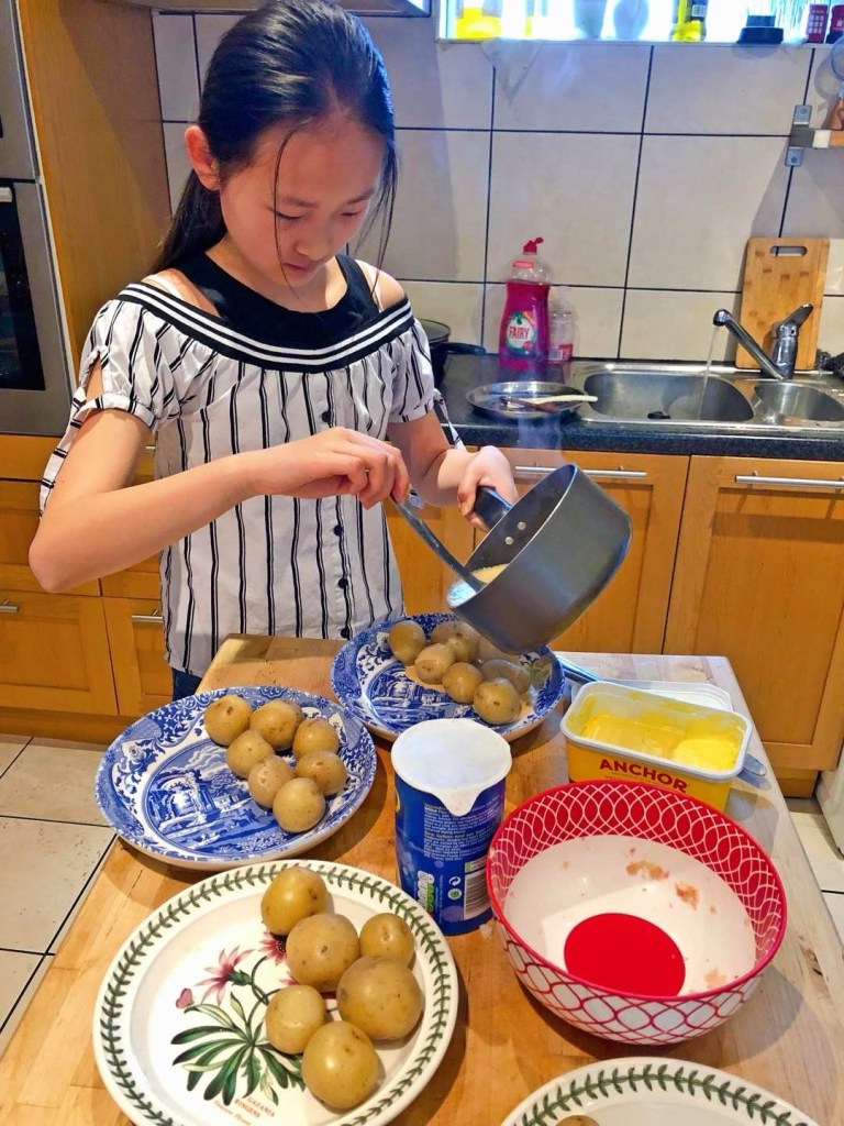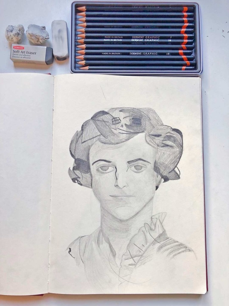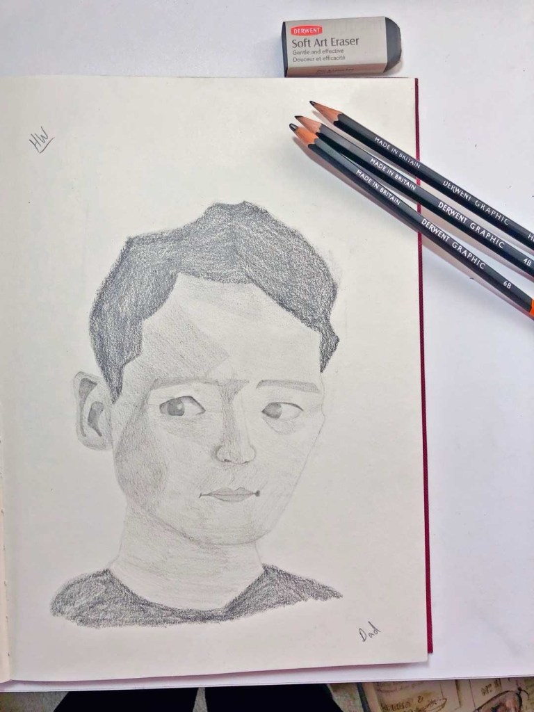 今晚芊大小姐主厨。用牛肉馅、黄油、面包屑和奶油揉成的肉丸子,配烤土豆。那个白色蓝边的陶瓷烤盘,让我一看就觉得屁股疼,定是小时候让医务室的漂亮阿姨给我扎出心理阴影了。芊大小姐人生第一幅人物素描,必须要我当模特,结果怎么看都不像我🙈。还是上星期的这张人物临摹好看。