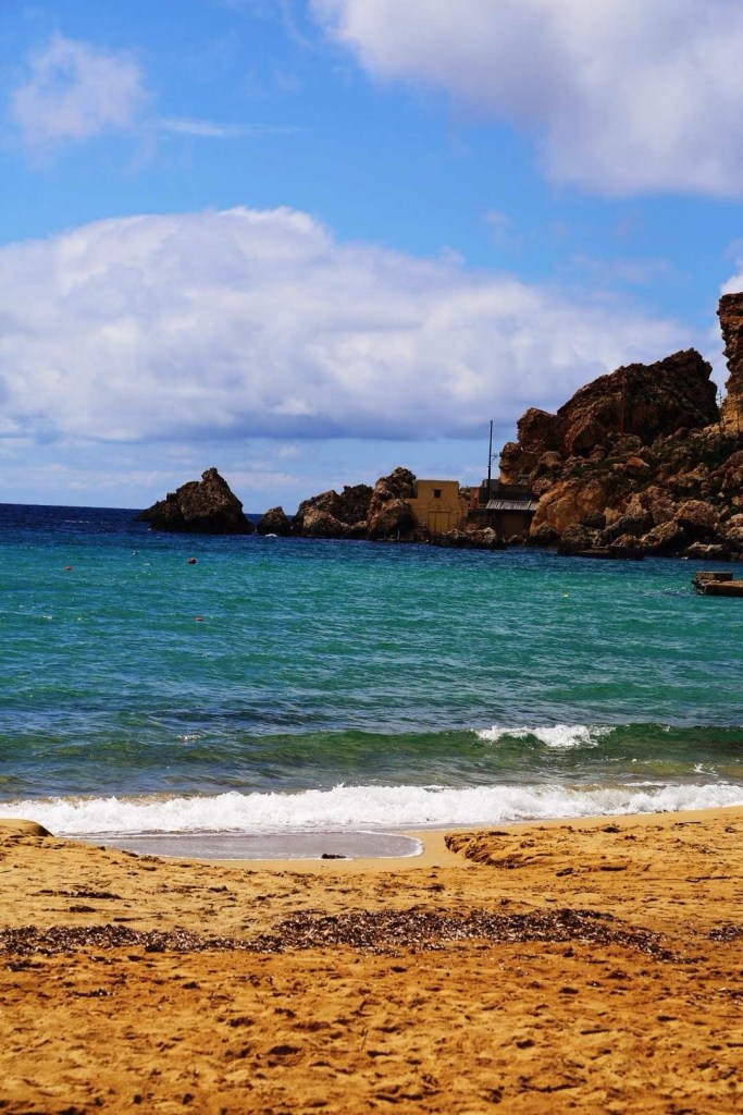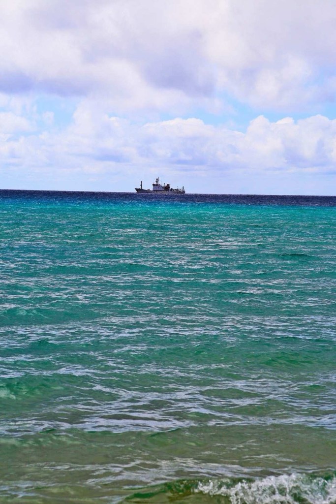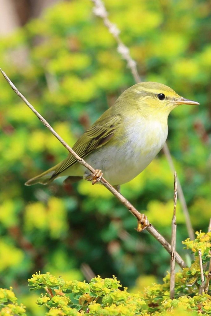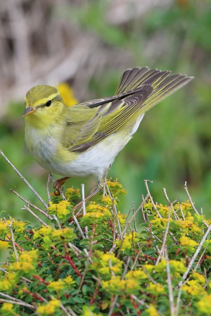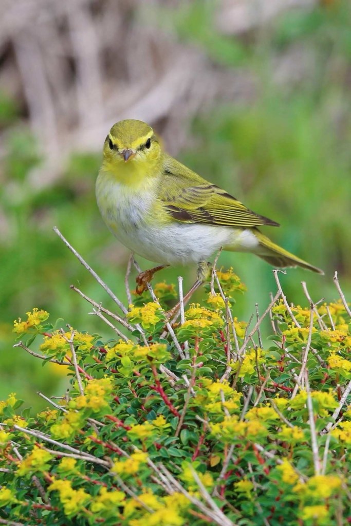金沙湾的岩石和海滩呈棕黄色,海水由近而远层次分明。图3极像儿时任天堂某款游戏中的场景,让人想立刻发射一枚鱼雷将其击沉。如果说机会是留给有准备的人,美雀则是留给时刻背着长炮筒的摄影师。这只不知名的美雀隔着八丈远躲在灌木丛中,和周围的黄花绿叶融为一体。