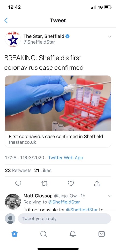 今日确诊谢菲尔德首例,在坚持了一个多星期后,这座山城还是沦陷了。