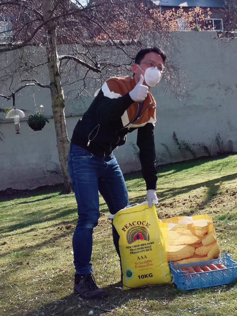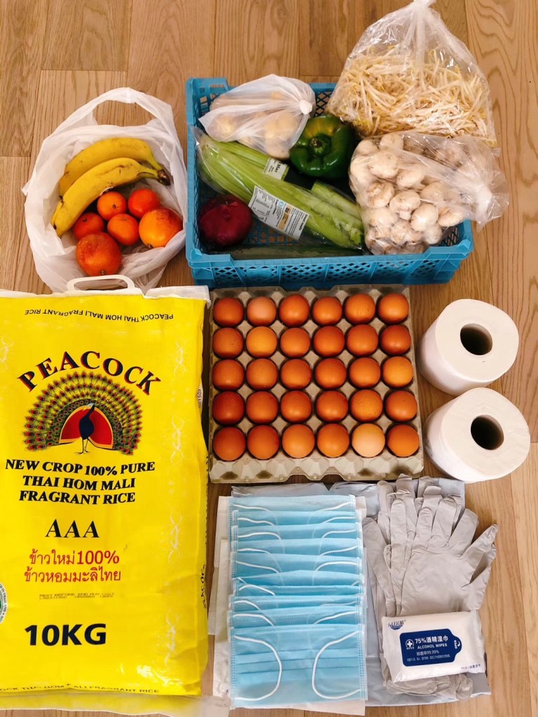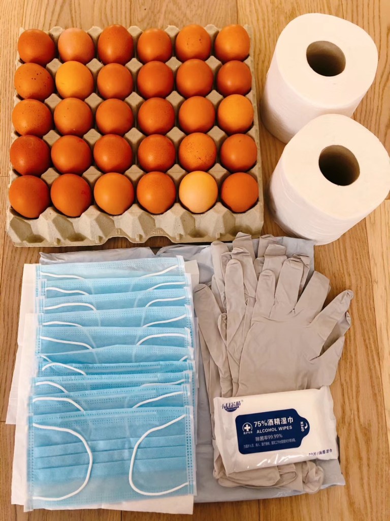 今天第一次给老华侨送物资,特别感谢热心的中餐馆老板赞助的大米鸡蛋蔬菜水果,我再送她一些口罩手套卫生纸和酒精湿巾,希望她平安度过疫情。老人家的防护意识很强,我把物资留在她家门前的草地上,等我走后她戴着口罩推着小购物车自己往屋里搬。