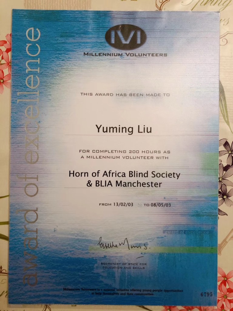 2003年在索马里难民定居点帮助因战乱致盲致残而失去劳动力的家庭,完成200小时的志愿服务后获得市政厅的表彰。