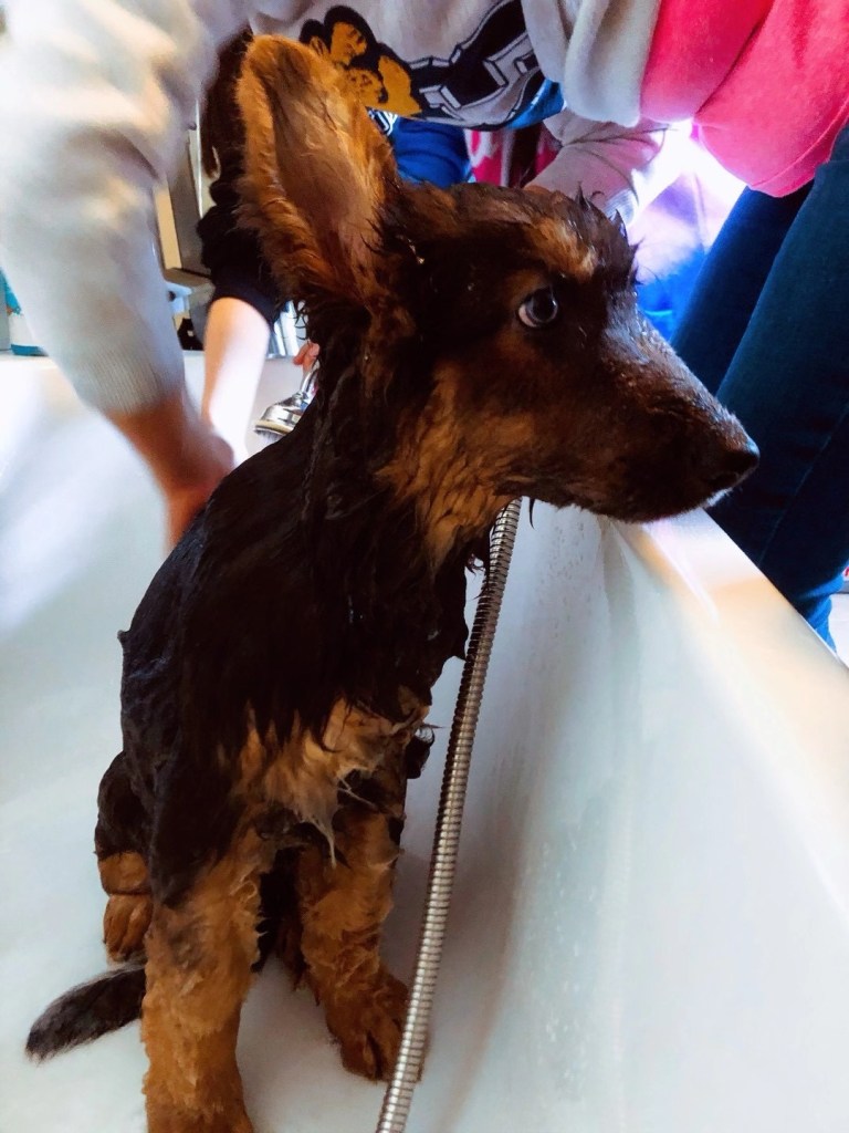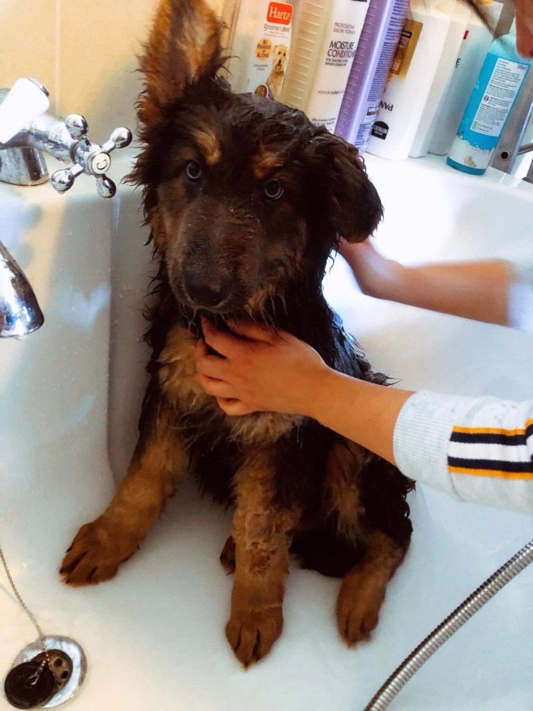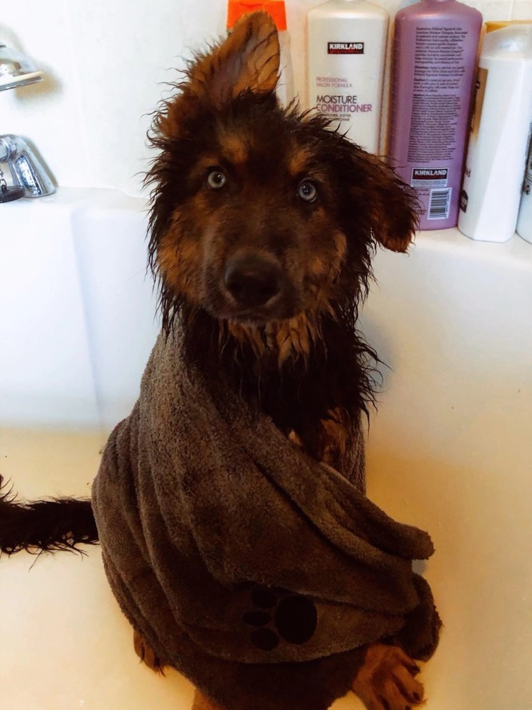 验证狗狗是肥是瘦的时刻到了。别看平日在花园里威风八面,跟我打闹时凶狠无比,放进浴缸里都是同一副“狗德行”。乖得像只小猫。澡前很丰满,澡后很骨感。还不到9岁的甜胖子身高接近一米四(138),小胖脸戴上口罩后分外溜圆。晚饭后自己打开冰箱捡一盘水果边吃边看电视,我本想问“洗了些什么水果?”,结果一看盘子,话到嘴边就变成了“你还有什么水果没洗?!”