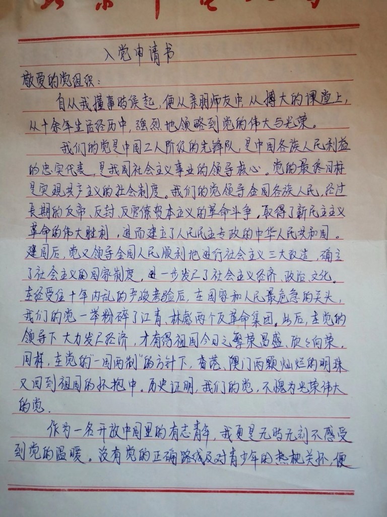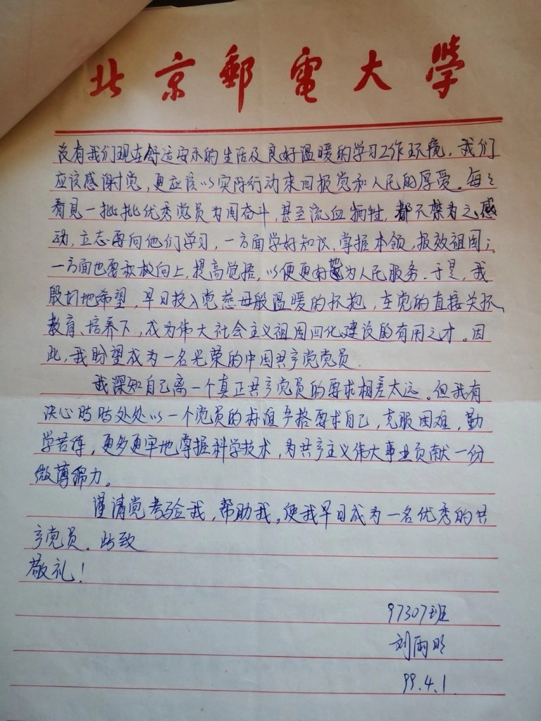 老娘终于要告别近二十年的“北漂”生活,回老家养老。这几日收拾北京的房子以便招租,竟然翻出我当年在北邮留下的书信来。这是我当年的入党申请书,却不是我的字迹。那是一个“成绩就是一切”的年代。只要在学业上出类拔萃,连入党申请书都由团委书记亲自替我写好。可惜我选择了新东方,而放弃了上党校,于是至今仍留在群众的队伍里。我的字写得很差,手稿真迹是真的见不得人,如今想来这大概是当年鸿雁传情皆无疾而终的主要原因。