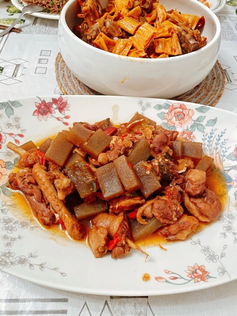 魔芋啤酒鸭。难得还能在这边买到魔芋豆腐,聊凭儿时记忆做这道老爸以前经常做给我们吃的家常菜。啤酒鸭还是三十年前的味道,远逝是那个无忧无虑的年代。农家小贩挑着俩箩筐魔芋豆腐沿街叫卖,我们揣着两块钱钻进巷尾的游戏厅,老爸骑着摩托车去三眼井买老鸭婆,老妈在店铺里为了几毛钱跟顾客吵得面红耳赤,奶奶在家等着接我们去娄底过年,爷爷正襟危坐看着新闻联播心系国家大事。那个年代大家都不富裕,但日子过得很安乐。芊大小姐不能理解我们那个年代的乐趣,却也喜欢吃魔芋啤酒鸭,也开始凭着她的记忆做我常做的豆角炒牛肉。