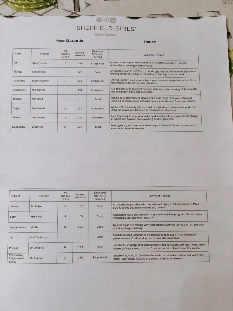 芊大小姐终究没有令我们失望,今年的期末考试考出全A+A。12门主课(体育和戏曲除外)有6门得了最高分9分(或A)和6门8分(或A)。9分课程为:美术、物理、化学、计算机、历史、哲学与宗教。这次数学和法语稍有失误,试卷成绩都是129分,差1分错失A。(英国2018年将家长熟悉的A– G评分标准改成9-1评分标准。)