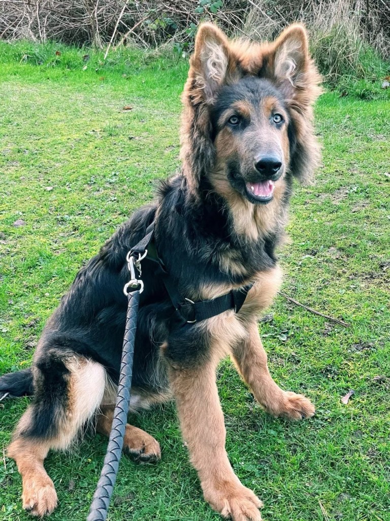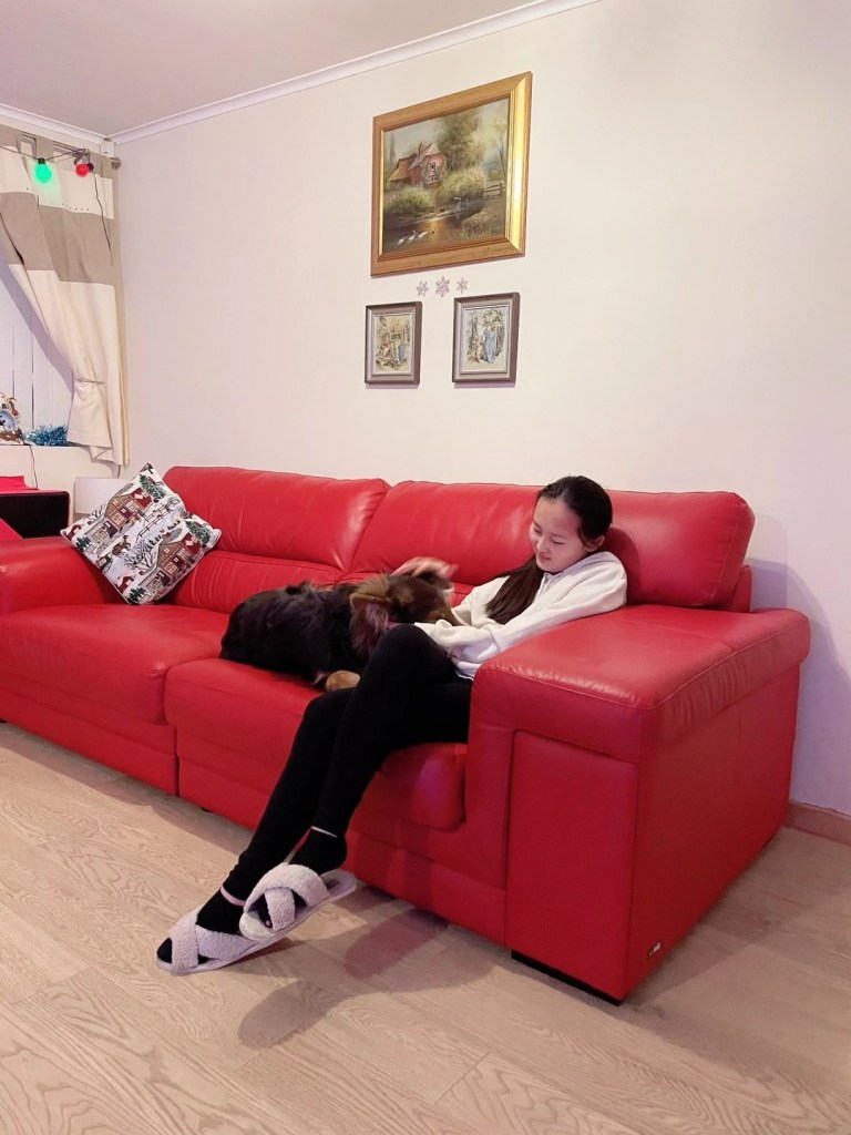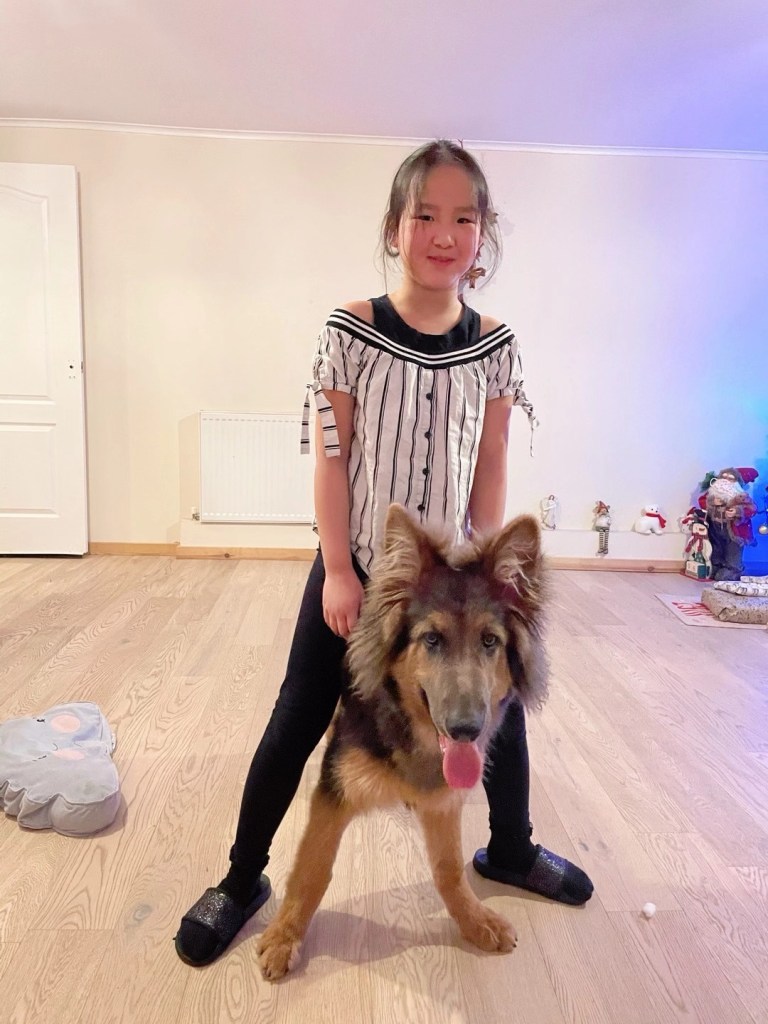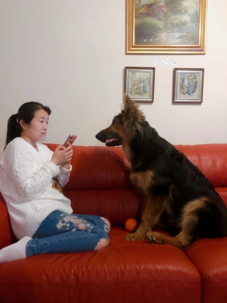 快六个月大的䖔开始茁壮成长成一只猛兽,在小区里享有极高的知名度。小区里养狗人士几乎人人都知道这里多了条一头金发体型巨大的“小狗” – Hunter。虽然外表凶悍,但心智还只是小娃娃的䖔很粘人,整天就想找人陪它玩球,喜欢躺你怀里吃冰激凌,喜欢跟我挤在沙发上睡大觉,每天要吃掉一大根猪骨,一根牛骨和好几块羊骨。出门遛弯时开始喜欢追车,以及用狂暴的怒吼来吓唬其他的小狗,于是又得了个很中国风的绰号,“旺财”。