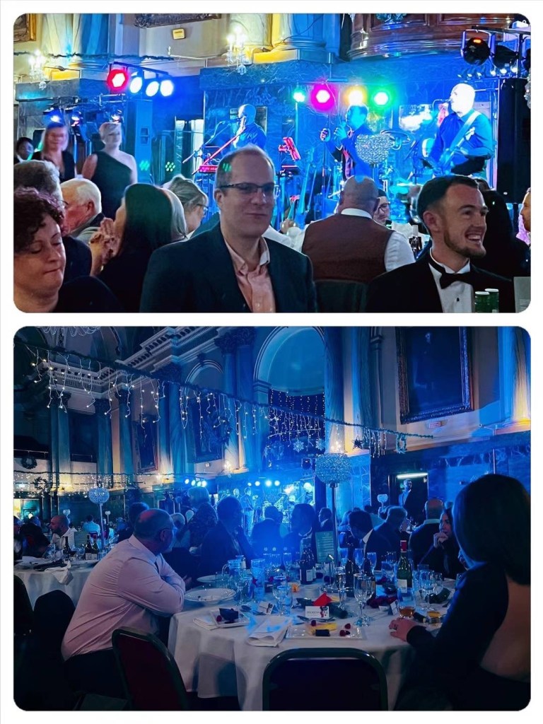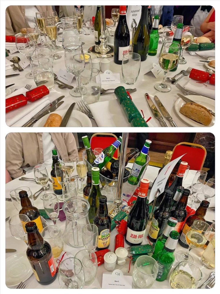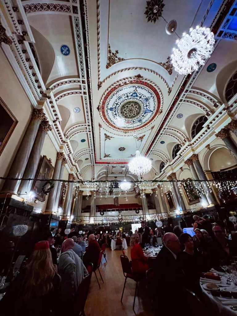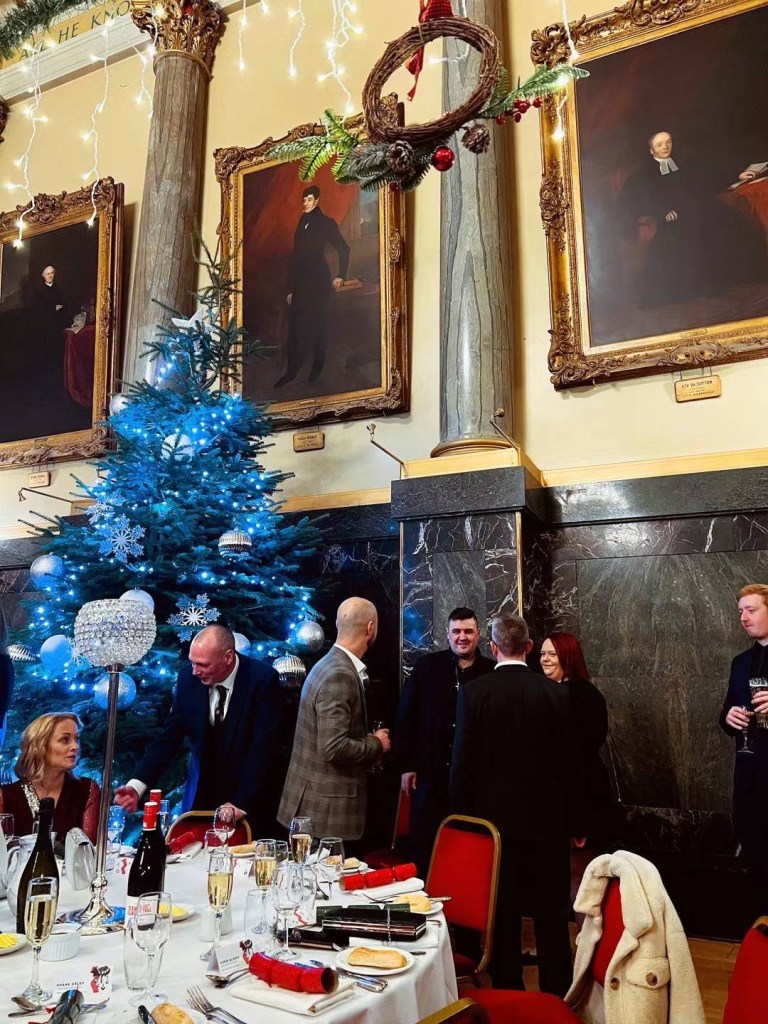 刘太公司的圣诞餐今年选在谢菲尔德最高档的酒店之一The Cutlers Hall。这种地方是吃就餐环境的,食物很小份,根本吃不饱。前菜、主食、甜点的三件套加一起都没有俩包子大。这家酒店原本是谢菲尔德制造业企业家们的高级私人会所,本地制造业衰落后,如今也对外营业,只是收费比较贵,以企业聚餐和婚庆寿典为主,不是普通老百姓消费的场所。
