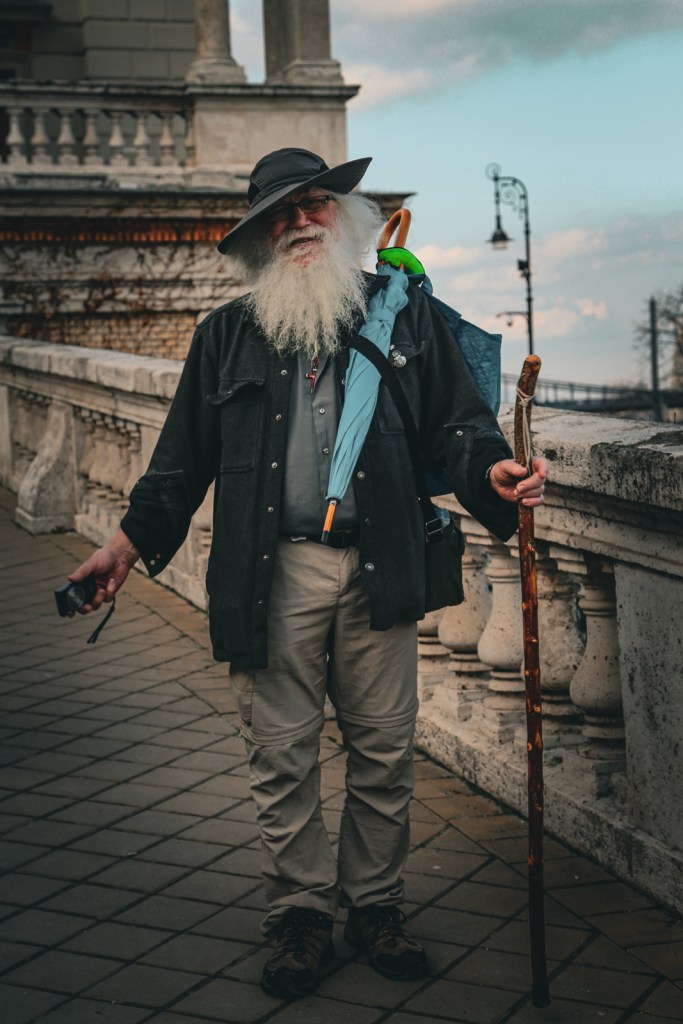 爬山途中偶遇一位白胡子老汉,外形竟与龟仙人有几分相似,拄着手杖,背着行囊,胸前着别一把大雨伞,手里捏着一台小相机,我礼貌地邀请他驻足让我拍了这张肖像。这大概是我八十岁以后背不动单反机和大镜头的样子。