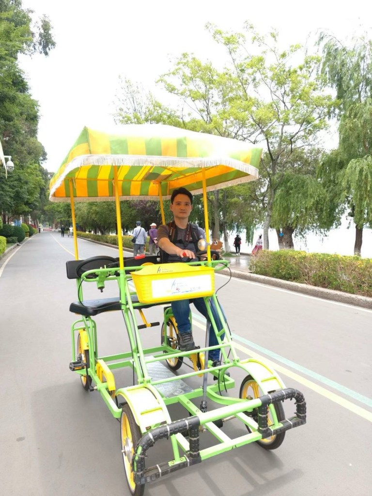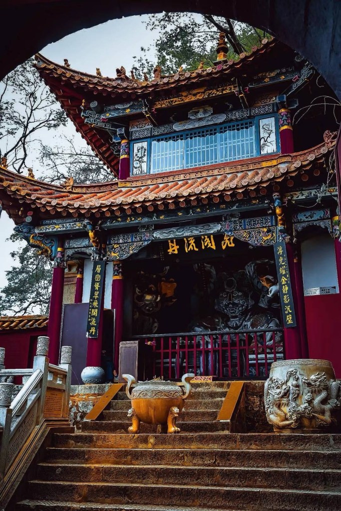 出了民族村,累得连一步路都走不动的老娘只能打滴滴前往马路尽头仅800米远的滇池。为了让老娘不再走路,我租了辆自行车,载着老娘走马观花地游了一下滇池和海埂,然后坐索道上西山。西山的庙宇楼阁、亭台轩榭、画栋雕廊、石阶岩窟都颇具特色,是白天行程里唯一让人赏心悦目的地方。