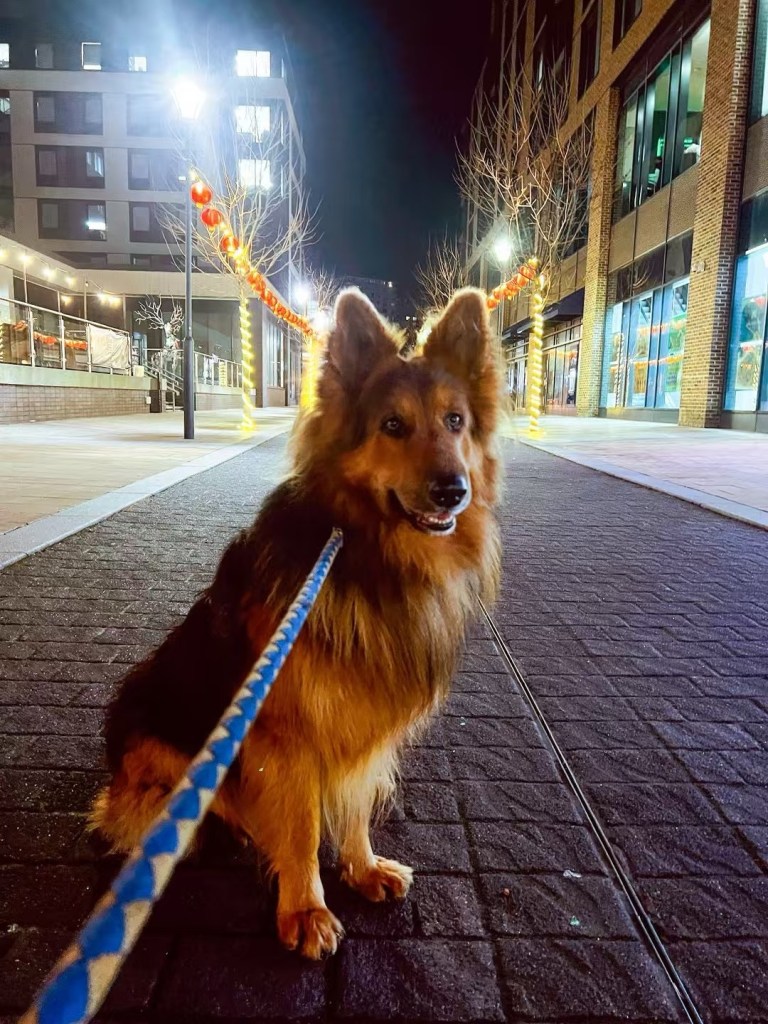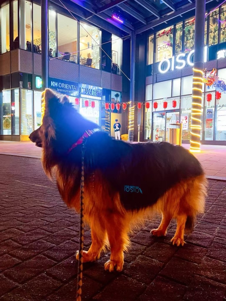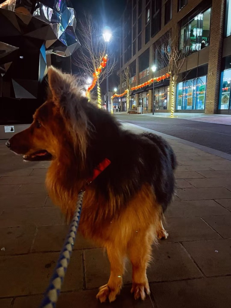 完成了一项挑战。牵着䖔,夜间徒步10公里从家走到市中心,耗时一小时五十九分钟。最痛苦的一段是一公里长的乡间公路,没有路灯,全靠往来车辆的灯光以及自己对道路的记忆,基本上是在黑暗中摸索前进。其次是在晚上孤身一人横穿治安极差的Gleadless廉租房区,还好有䖔傍身,大型狼犬的威慑力还是不容忽视的。最终到达市中心学生公寓楼下,体型硕大的䖔很快就吸引了众多中国留学生的注意,纷纷上前跟它拍照。走得筋疲力尽的䖔也没了攻击欲望,在人前显得异常温顺可爱,乖乖地等候在电话里万分惊讶的妈妈驾车赶来接我们。这项挑战其实我已经规划了很久,旨在测试自己的体能和磨练自己面对困难和不确定因素时的意志。