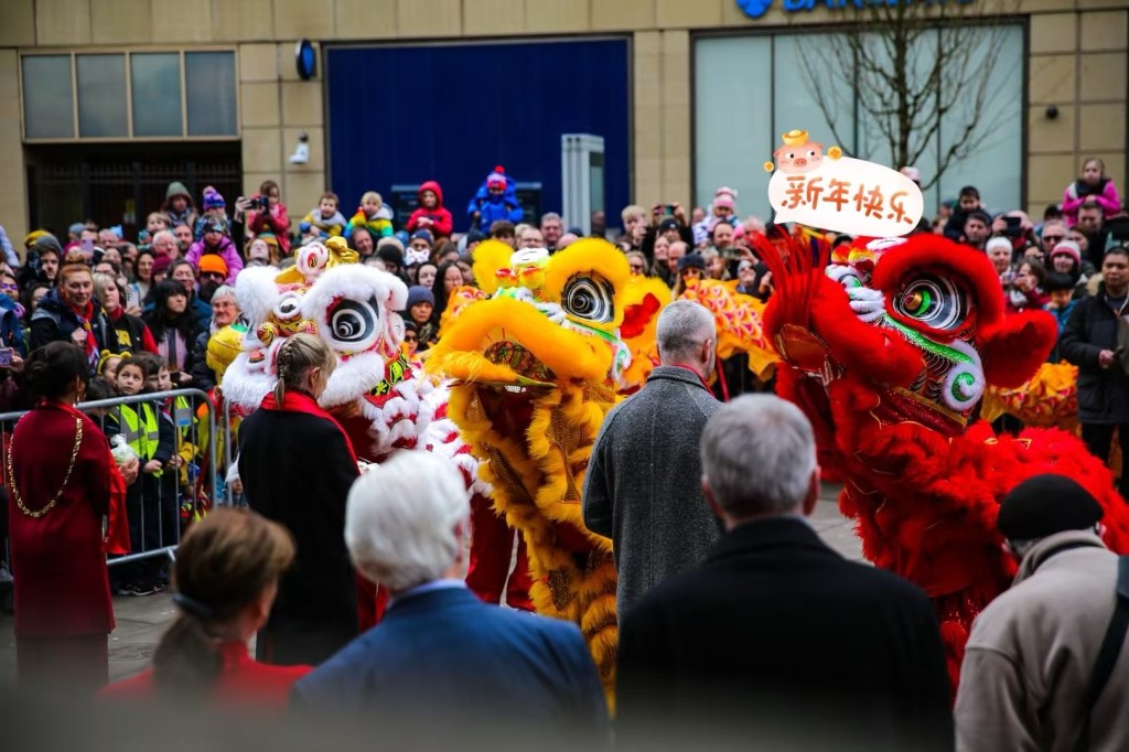 市中心的中国农历新年庆祝活动。开场前政治人物轮流发表长篇大论的演讲时,我就预感到这是节目不够演讲来凑。轮到曼城领事讲话时人群里突然有些人打出XX旗帜并高喊XX口号,但都很克制,没有引发不必要的麻烦,而且在领事讲话结束后便迅速安静离场。今年的节目确实比去年少很多,没有太多亮点,就连服装秀都不如杜丹她们二十年前走得有风采。佛山的舞狮队很专业,在高桩上行走跳跃如飞,不是本地业余舞狮队能比的。