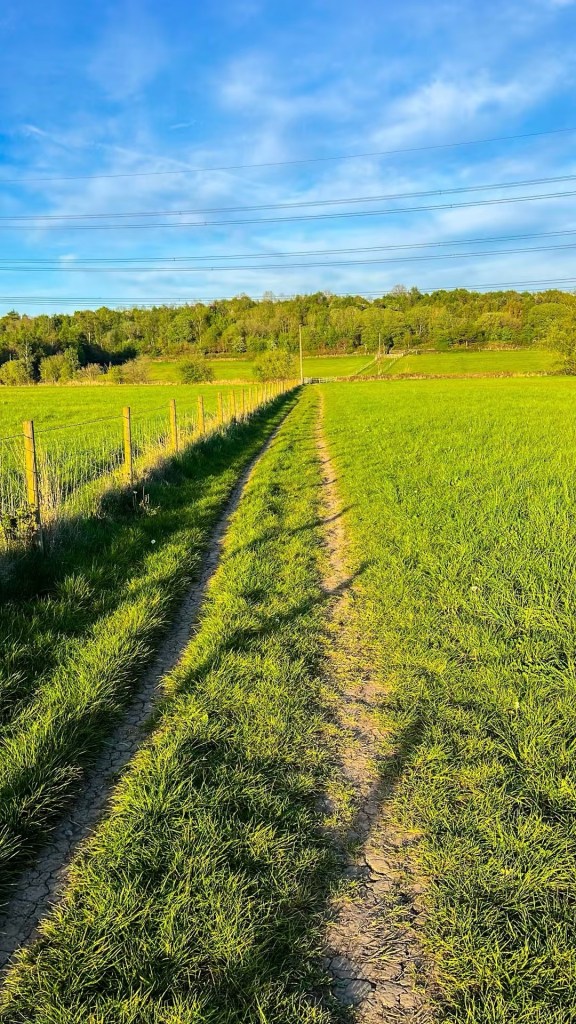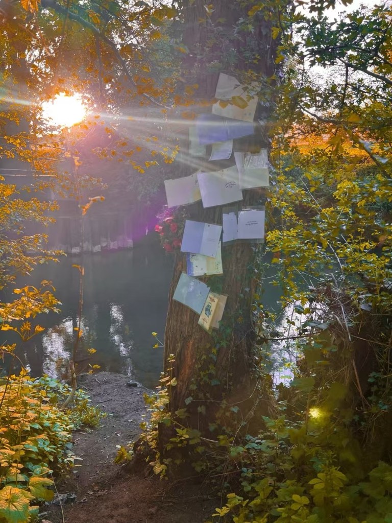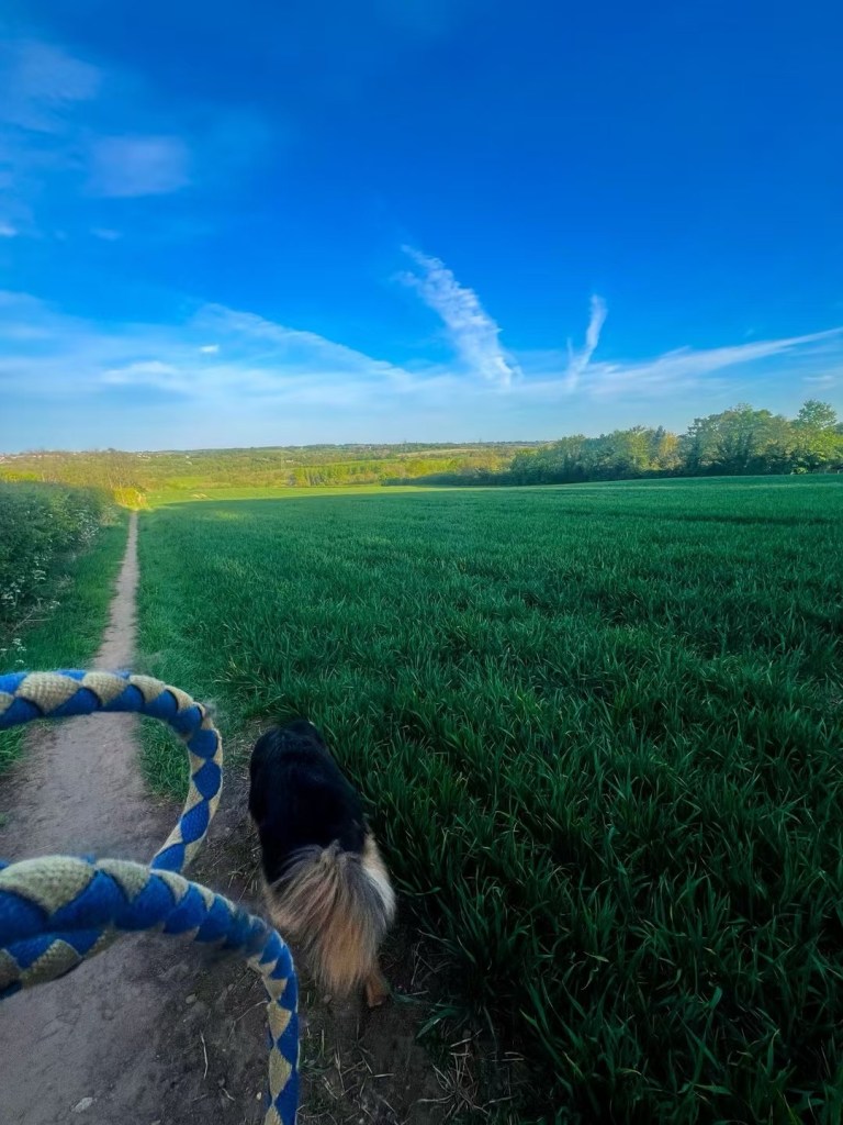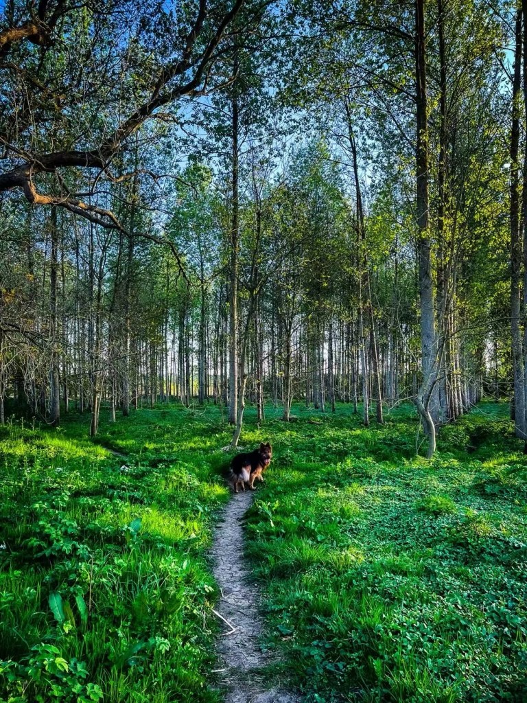 在这里住了二十年,居然都不知道小区外的公路旁有一条隐蔽的田间小路可以连通四周的几个主要村镇。刘太在家跳健身操,于是我自己牵着䖔在小区周围瞎溜达。这条小路平日里杂草丛生,不似常有人走,而我一贯喜欢寻幽探秘,便怀揣着好奇心钻了进去。没多久就窜到了山间的田野上,广袤的田野四下无人,可以一路欢快地走到山脚下的树林里。再往深处走林荫蔽日,茂密如织的植被像一块巨幅黛绿的地毯静谧地铺在笔直的秀木间。一番峰回路转之后,真个柳暗花明,竟然已经到了对面山头的村镇旁。回程时已经日薄西山,途径一座小桥,河畔的树干上钉着许多卡片,怀念着一个十四岁的男孩Logan,两年前他义无反顾地跳入湍急的河水中救起落水的女伴,不幸付出了自己的生命。
