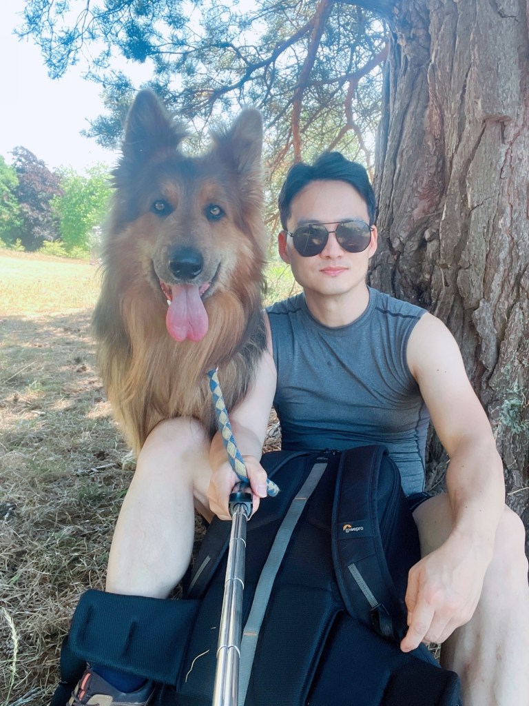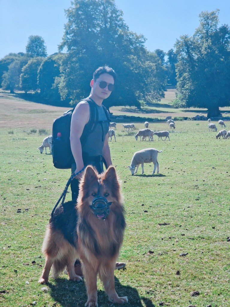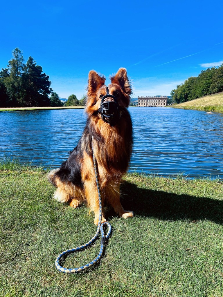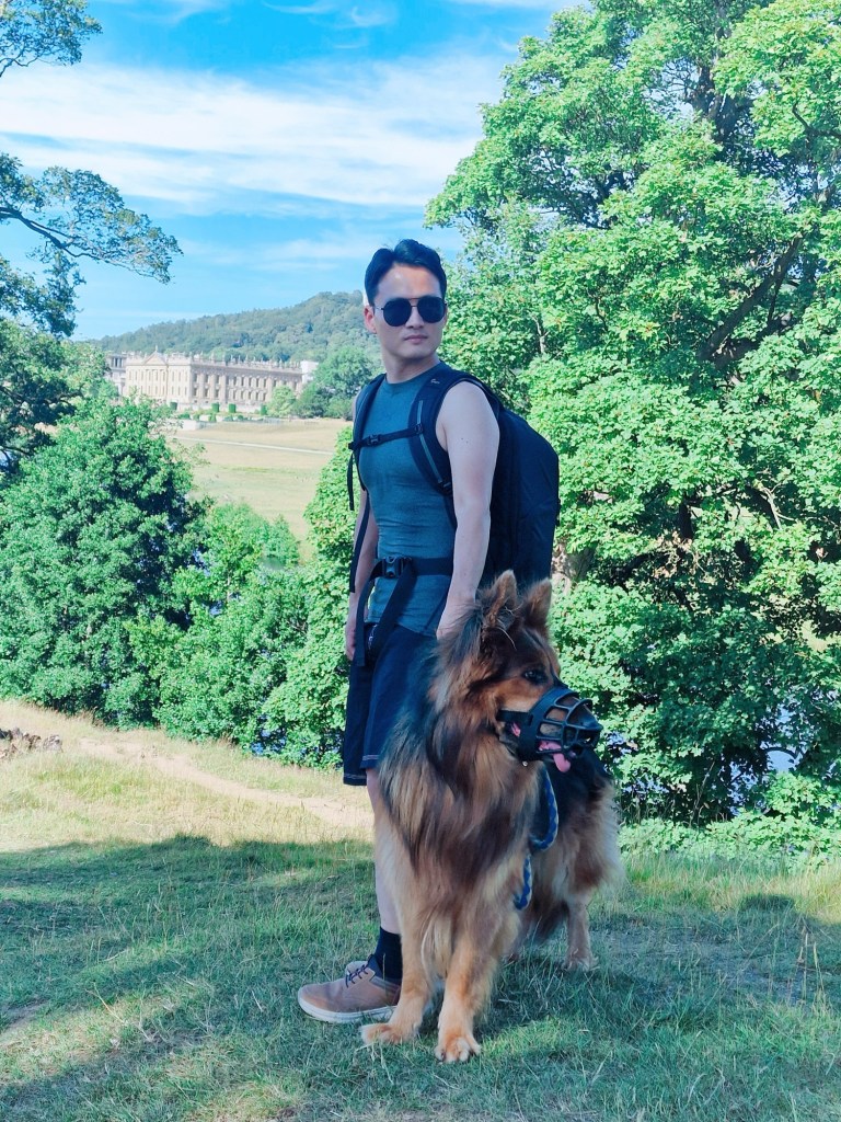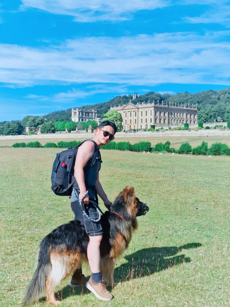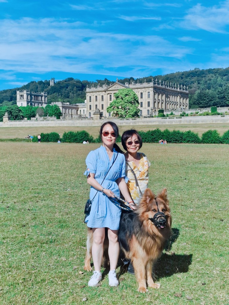 英国热浪袭人,周六在家无聊,便带着䖔独自来Chatsworth游玩。除了在售票处用突如其来的一通震天怒吼将售票大爷的魂魄差点吓出来之外,猛兽䖔全程还是很听话很友善的。我们快往回走时,Cherie带着几位老华侨来此消暑,其中有曾经帮衬过我的老侨领,励贤会主席萍姐,于是我赶紧过去打招呼。䖔大概是累极了,对第一次见面的老萍姐居然表现得异常友善。然而吃惯了火锅羊肉卷的它看见小羊羔还是忍不住想冲过去逮来吃,它脑子里很清楚谁的力气拽不住它,一旦不是我牵着就发狂猛冲,差点儿把Cherie拽进河里。