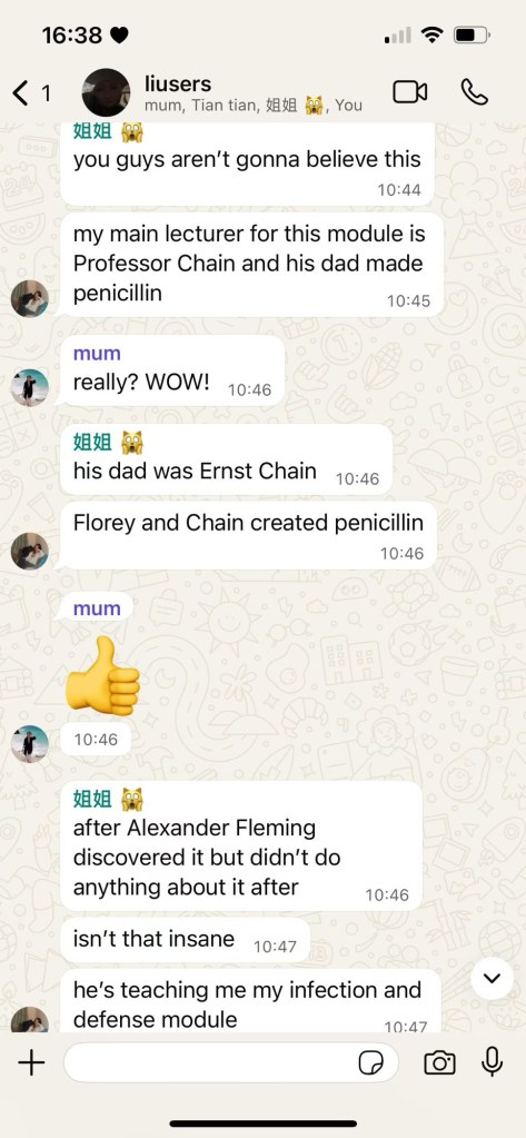 芊今天的infection and defense(感染与免疫)大课是Benny Chain教授主讲。这个名字一般人没听过,但他父亲Ernst Chain是一个非常令人尊敬的科学家。二十世纪人类最伟大的发明之一:青霉素药物,便是他父亲的成就,并据此获得诺贝尔医学奖。真的是个历史教科书里才能看到的名字。我小时候打青霉素都打出心理阴影了,特别是做皮试的那一针。